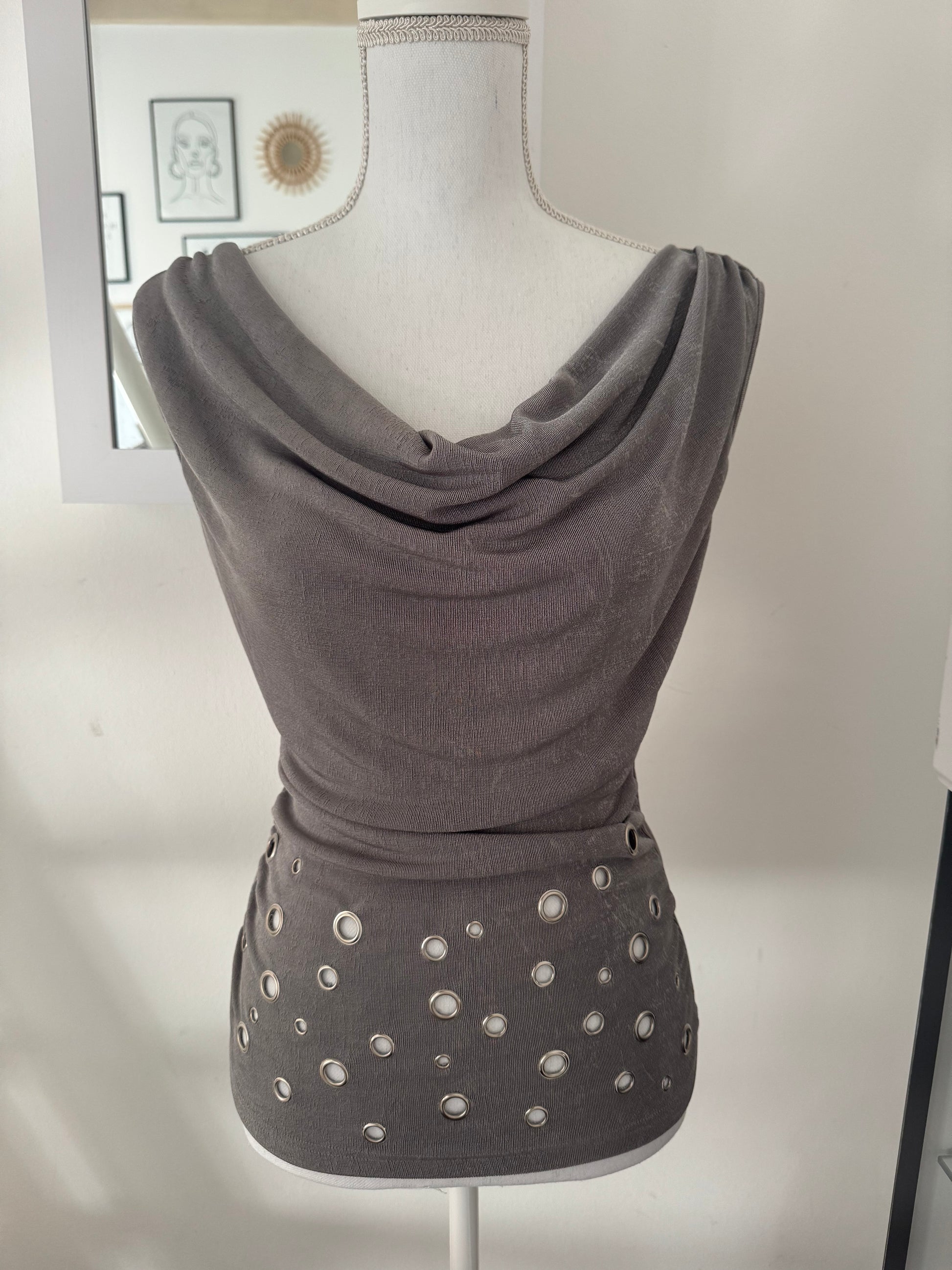 Dieses Top ist ein echtes Statement-Piece und vereint schlichte Eleganz mit edgy Details. Das Design wird durch sorgfältig platzierte Nieten veredelt und verleiht dem Top einen modernen, individuellen Look. Der weiche, anschmiegsame Stoff sorgt für einen angenehmen Tragekomfort und passt sich dem Körper schön an.